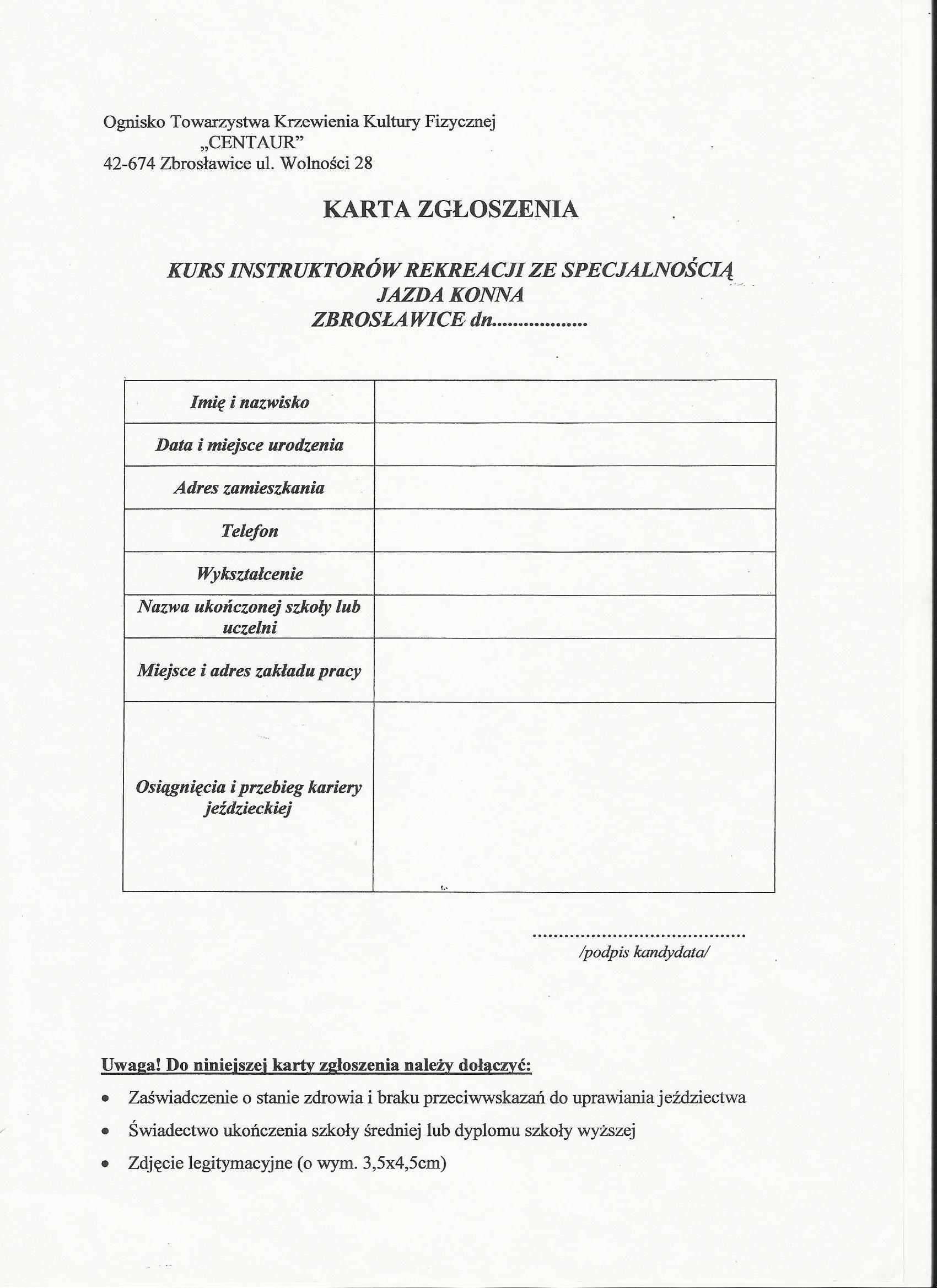Ognisko TKKF ‘CENTAUR” w Zbrosławicach informuje, że w dniach od 14 do 30 września 2012 odbędzie się kurs instruktorów rekreacji za specjalnością jazda konna.