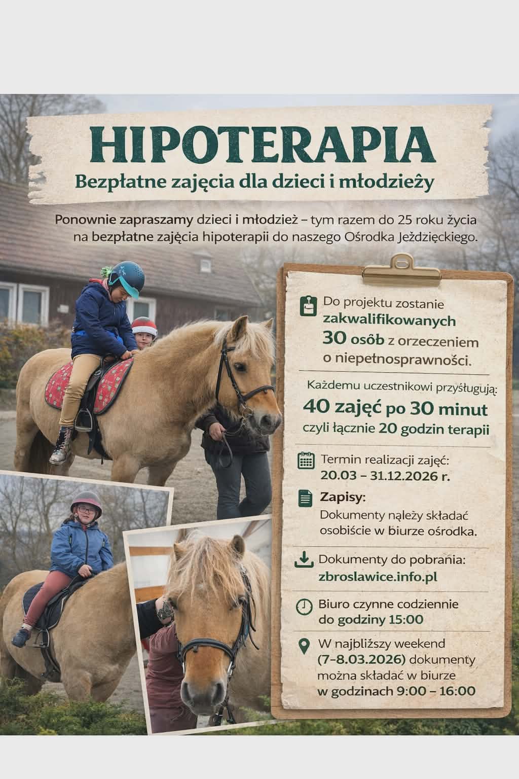 Ponownie zapraszamy dzieci i młodzież tym razem do 25 roku życia na bezpłatne zajęcia hipoterapii do naszego Ośrodka Jeździeckiego